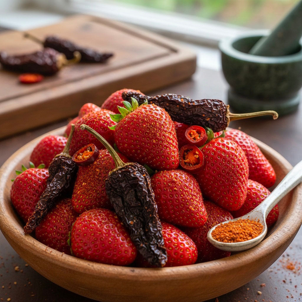 Avis aux amateurs de sensations fortes et de douceur sucrée ! Notre Fraise & Piment de Chipotle, c'est le mariage improbable entre la gourmandise d'une fraise de plein champ et le caractère fumé d'un piment mexicain. Ne vous fiez pas à sa couleur angélique, il a un sacré tempérament !